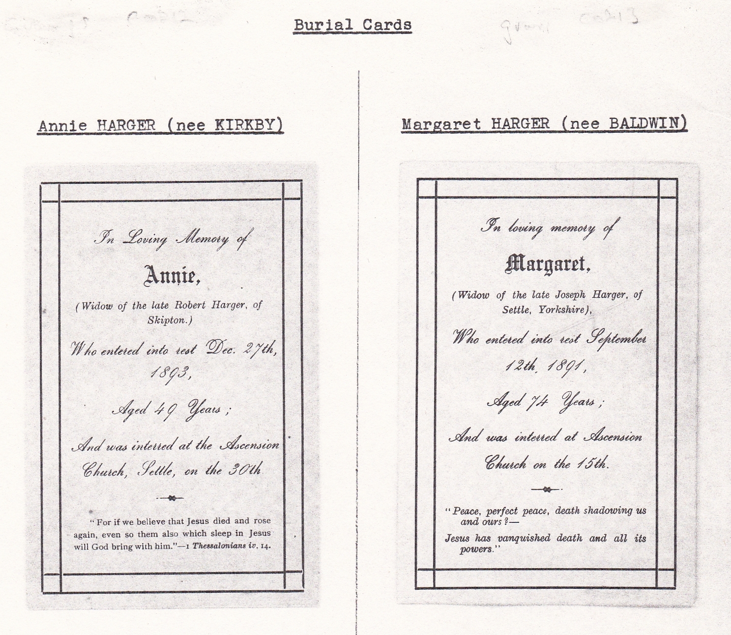(Mother of the above Robert Harger) Margaret Harger née Baldwin, born 1817, died 12 Sept 1891 Settle, buried 15 Sept 1891 Settle (Old A11)