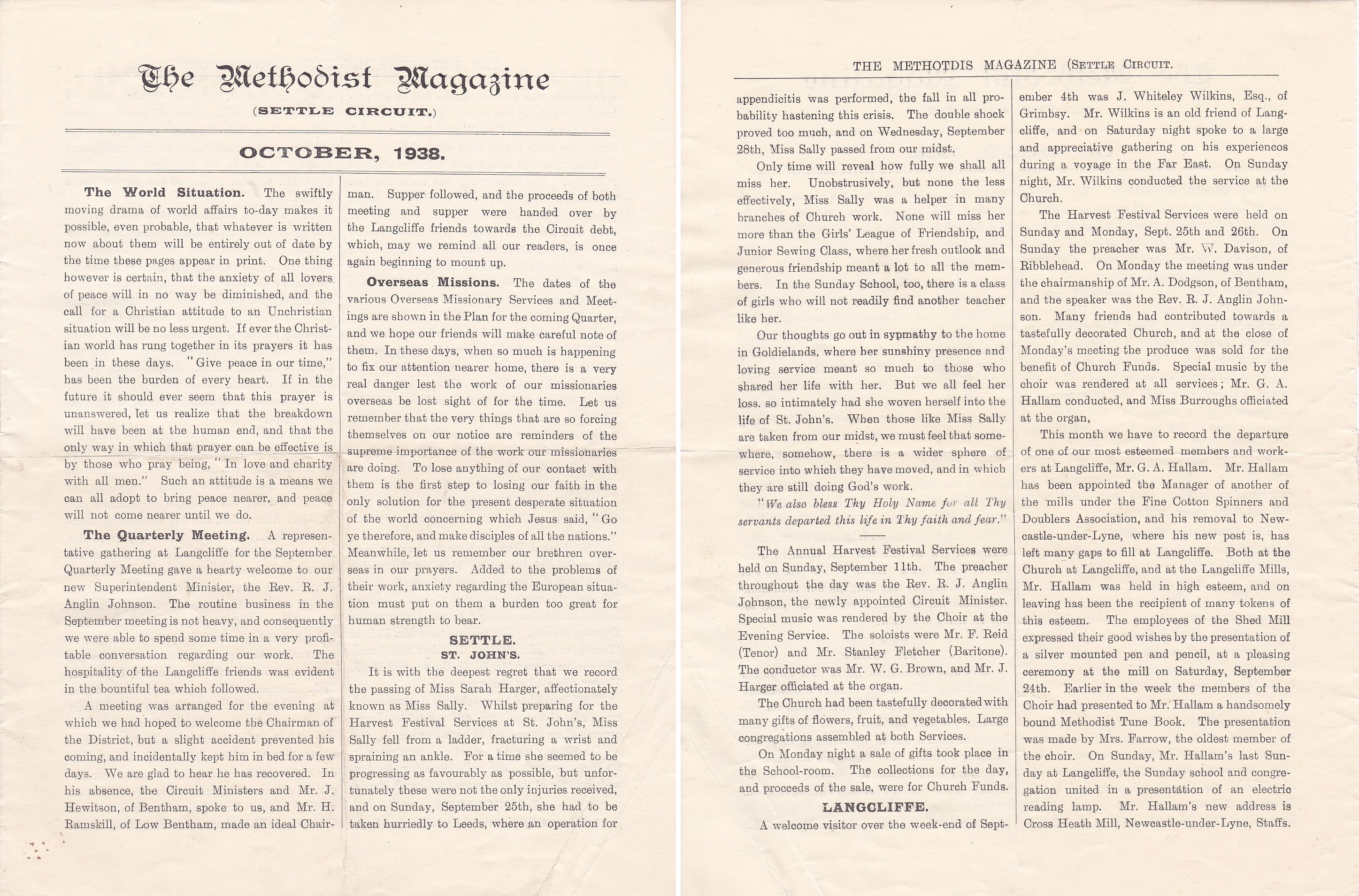 Sarah Agnes Harger (1876-1938): The Methodist Magazine (Settle Circuit) October 1938 (Buried Settle NEW J19, with aunts Kate and Polly)