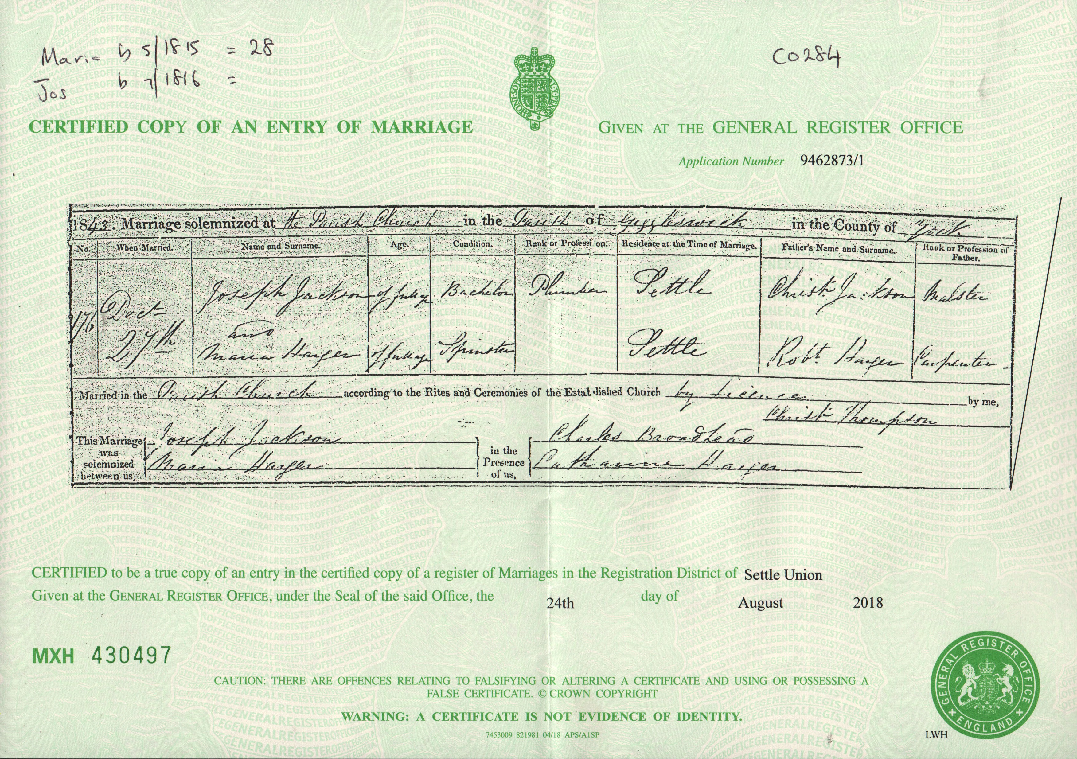 Victoria Cave: Joseph Jackson was involved in the discovery of Victoria Cave in 1838. The cave may have been initially discovered by Jackson's employee, Michael Horner, and a man named Jennings (Brayshaw and Robinson, 1932). Joseph Jackson was apprenticed to Richard Harger (1782-1833) in 1830, and seems to have taken on Richard's business in 1833 on his death. In 1843, Joseph married Maria Harger (1815-1867), daughter of Robert Harger (1775-1848). Richard and Robert Harger were brothers. NB: there are various sources that indicate that Joseph Jackson's wife, Maria, was the daughter of Richard Harger: this is not the case: Maria was the daughter of Robert Harger; this is supported by their marriage certificate.